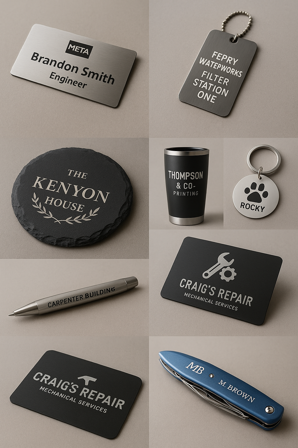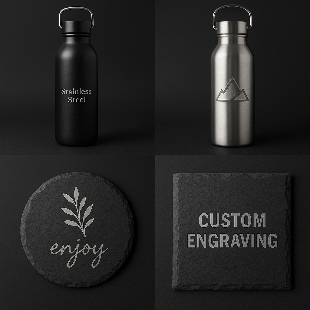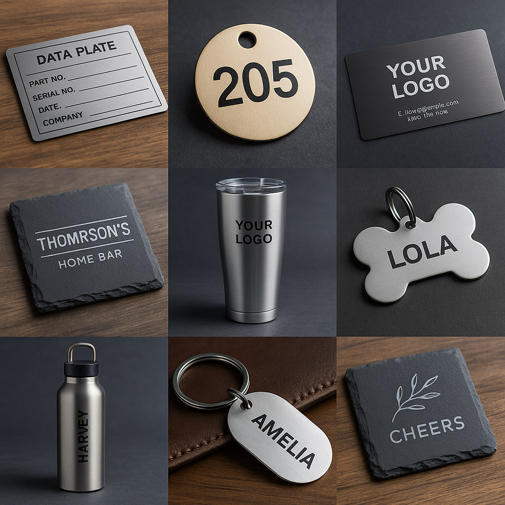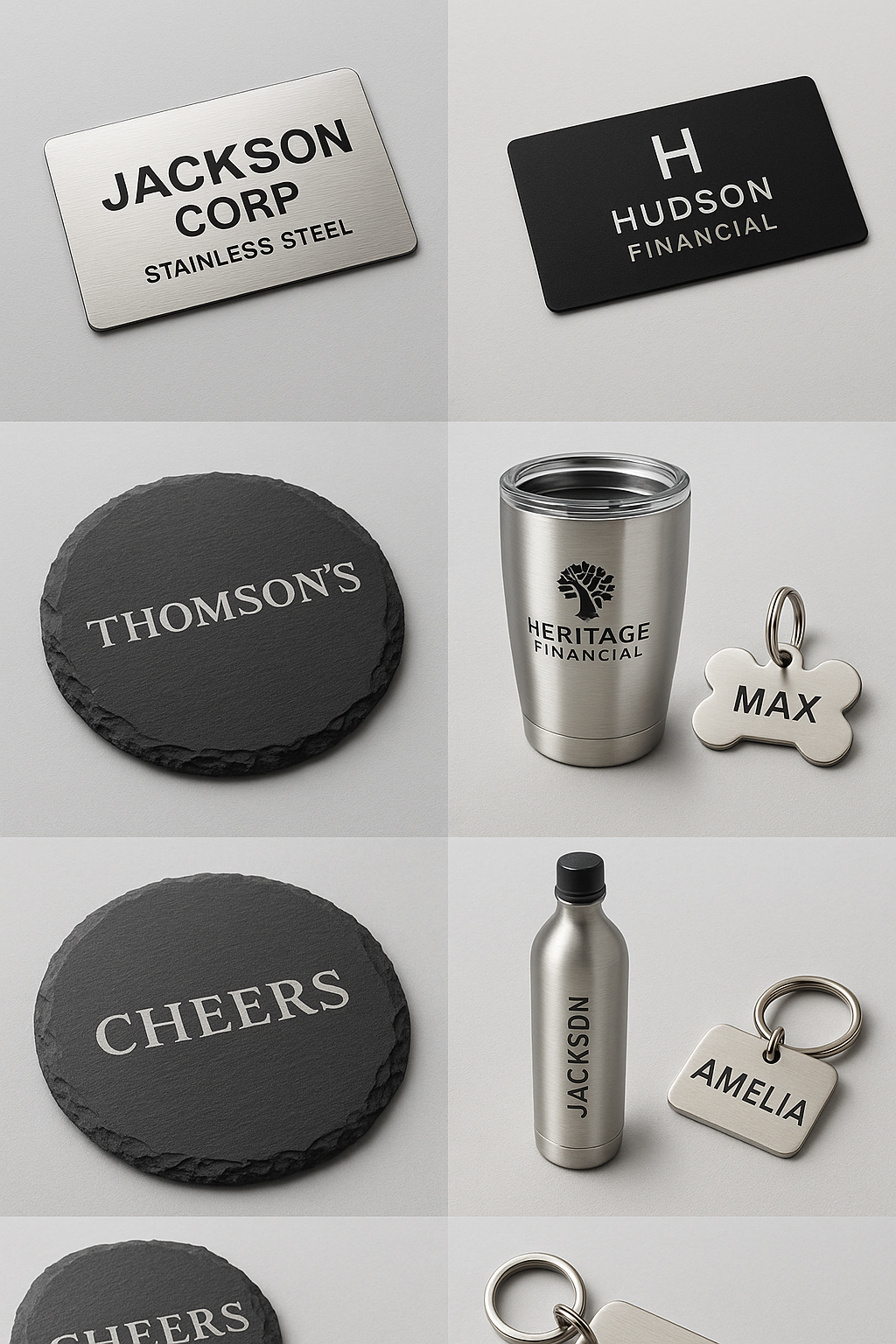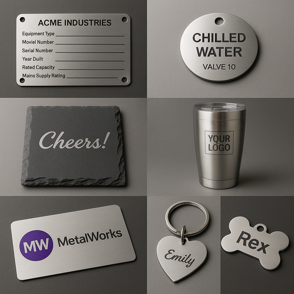 Metal plates and engraved stainless items.MetalWorks stainless steel branding plate.Slate coasters and engraved gift items.Tumblers and stainless pet tags.Laser engraved bottles and keyrings.MetalWorks engraved item.